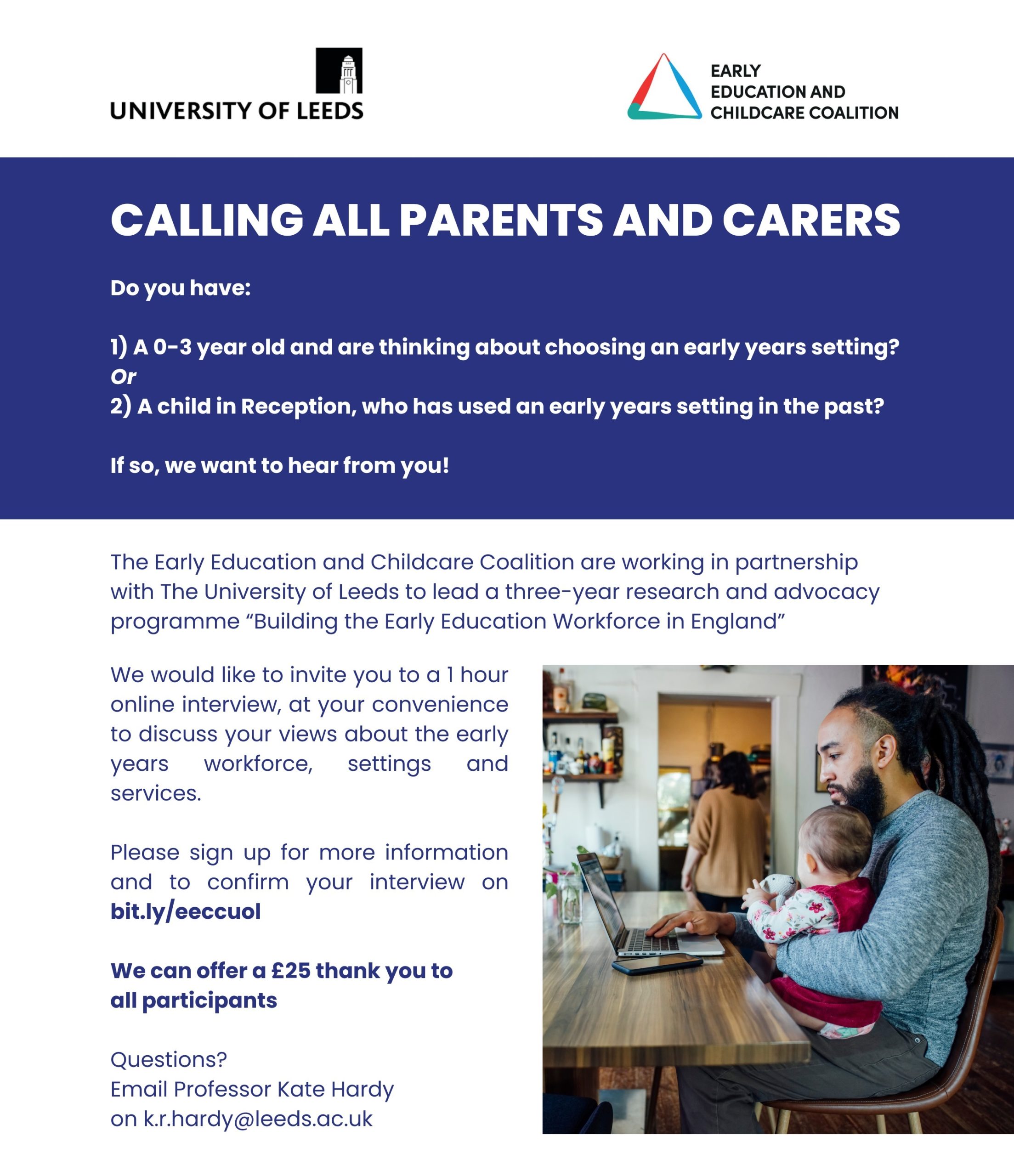 The University of Leeds and Early Education and Childcare Coalition are seeking the views of parents (both those who have not yet used formal childcare and those whose children are now in Reception) about the early years workforce.