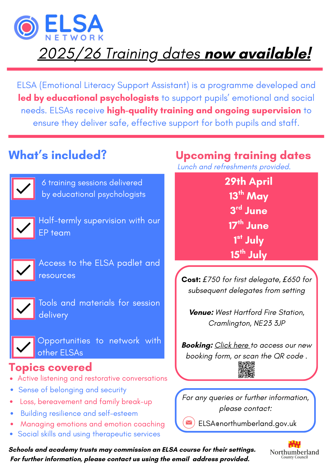 We are able to deliver courses commissioned by settings, trusts, or alliances. For further information, please email elsa@northumberland.gov.uk .